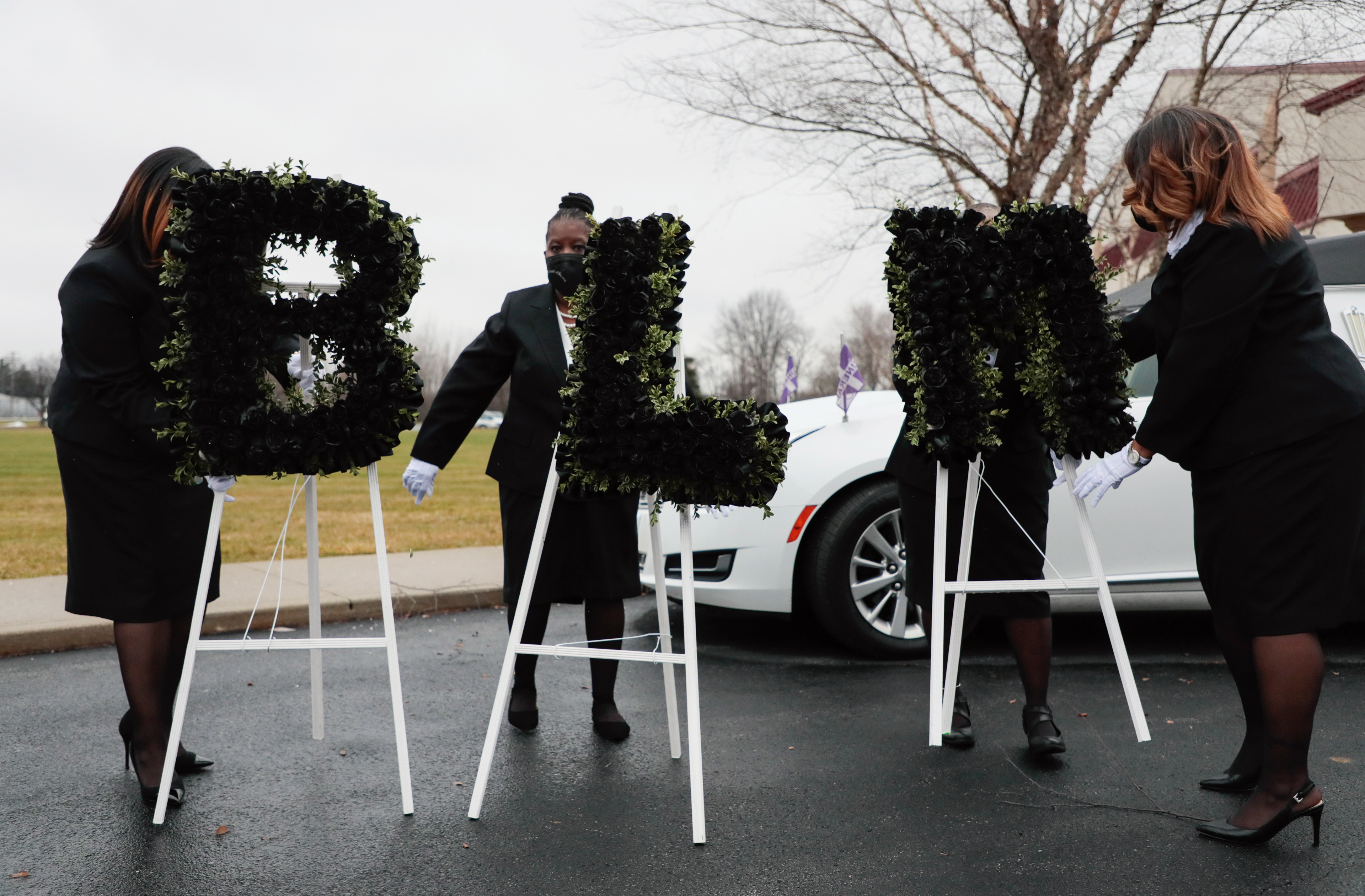 Church staff arrange flowers that spell out “BLM” before the casket of Andre’ Maurice Hill is brought to a hearse following his funeral on Tuesday, Jan. 5, 2021 at First Church of God in Columbus, Ohio. Hill, a 47-year-old Black man, was shot and killed by Columbus Division of Police Officer Adam Coy in the early morning of Dec. 22, 2020 after officers responded to a non-emergency call. According to body-worm camera footage from Officer Coy, Hill is seen inside a garage with his cell phone visible in his left hand and is shot within seconds of the interaction. Several minutes pass before any aid is rendered to Hill, who was known to the residents of the house and was expected to be there. Coy has been terminated from the division for his involvement in the killing and is awaiting trial on murder charges.