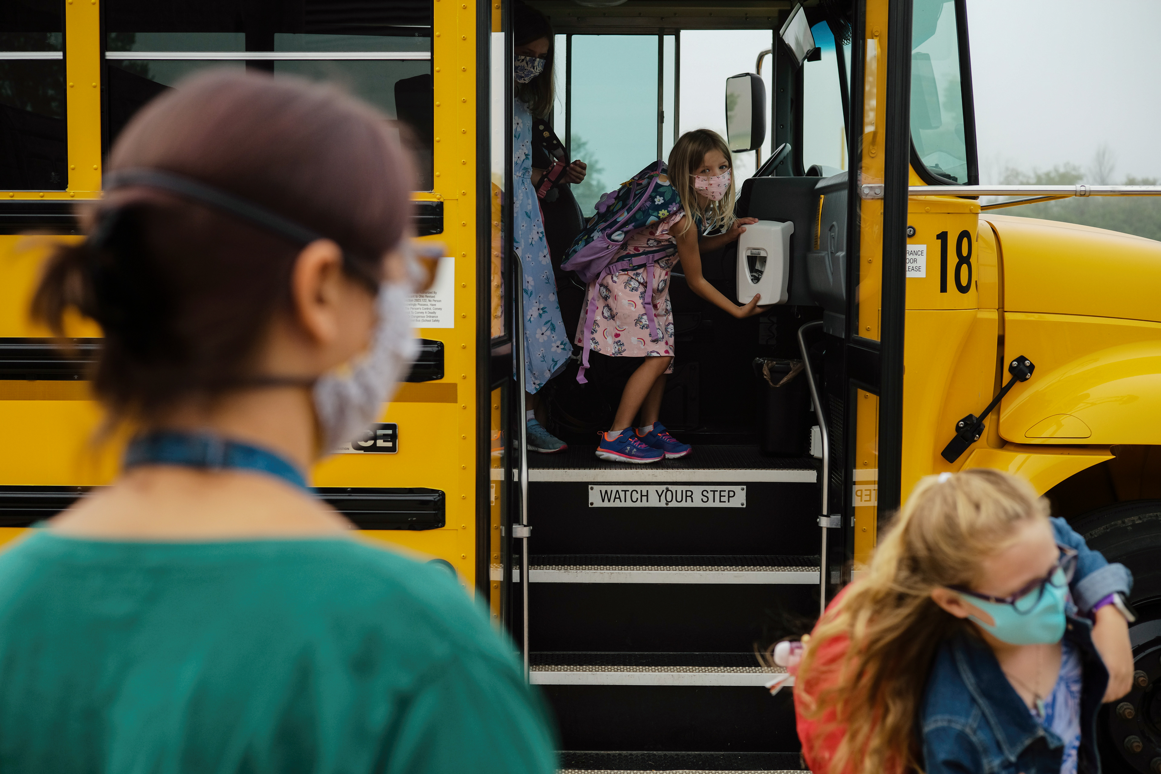 Students get hand sanitizer as they step off the school bus during the first day of school on Tuesday, September 1, 2020 at Heritage Elementary School in Lewis Center, Ohio. The Olentangy School District is adopting a hybrid learning model during the COVID-19 pandemic, with half the students in school buildings part of the week, and at home the other half of the week.