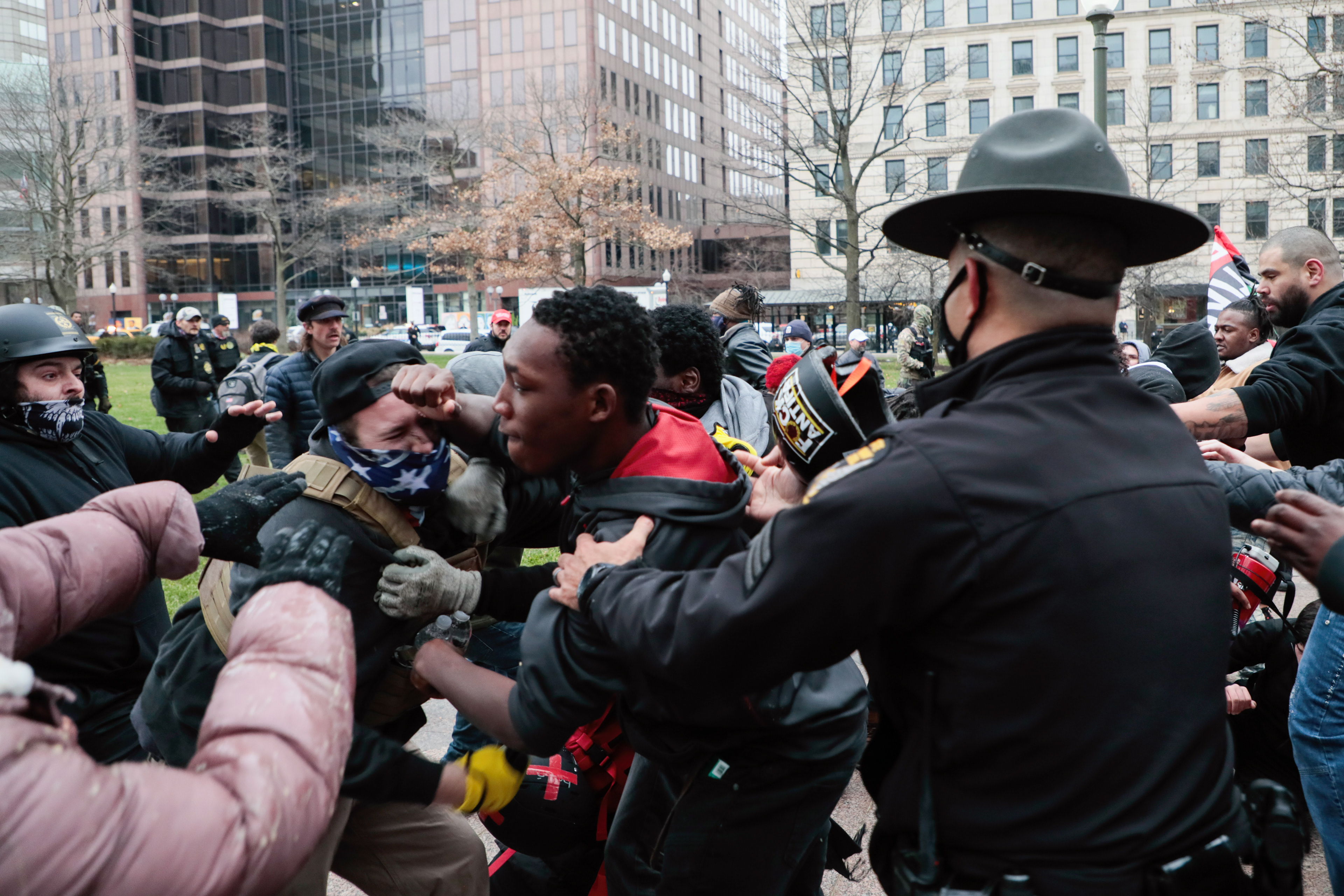 Counterprotestors and Trump supporters brawl as law enforcement officials intervene during a “Stop the Steal” rally on Wednesday, Jan. 6, 2021 at the Ohio Statehouse in Columbus, Ohio. Hundreds of supporters of President Donald Trump, including members of the Proud Boys, a far-right, male-only political organization, came to the Statehouse to protest the congressional certification of Democratic President-Elect Joseph R. Biden Jr., who defeated the incumbent Republican President Trump during the November 2020 elections and whose victory was certified by the Electoral College in December 2020.