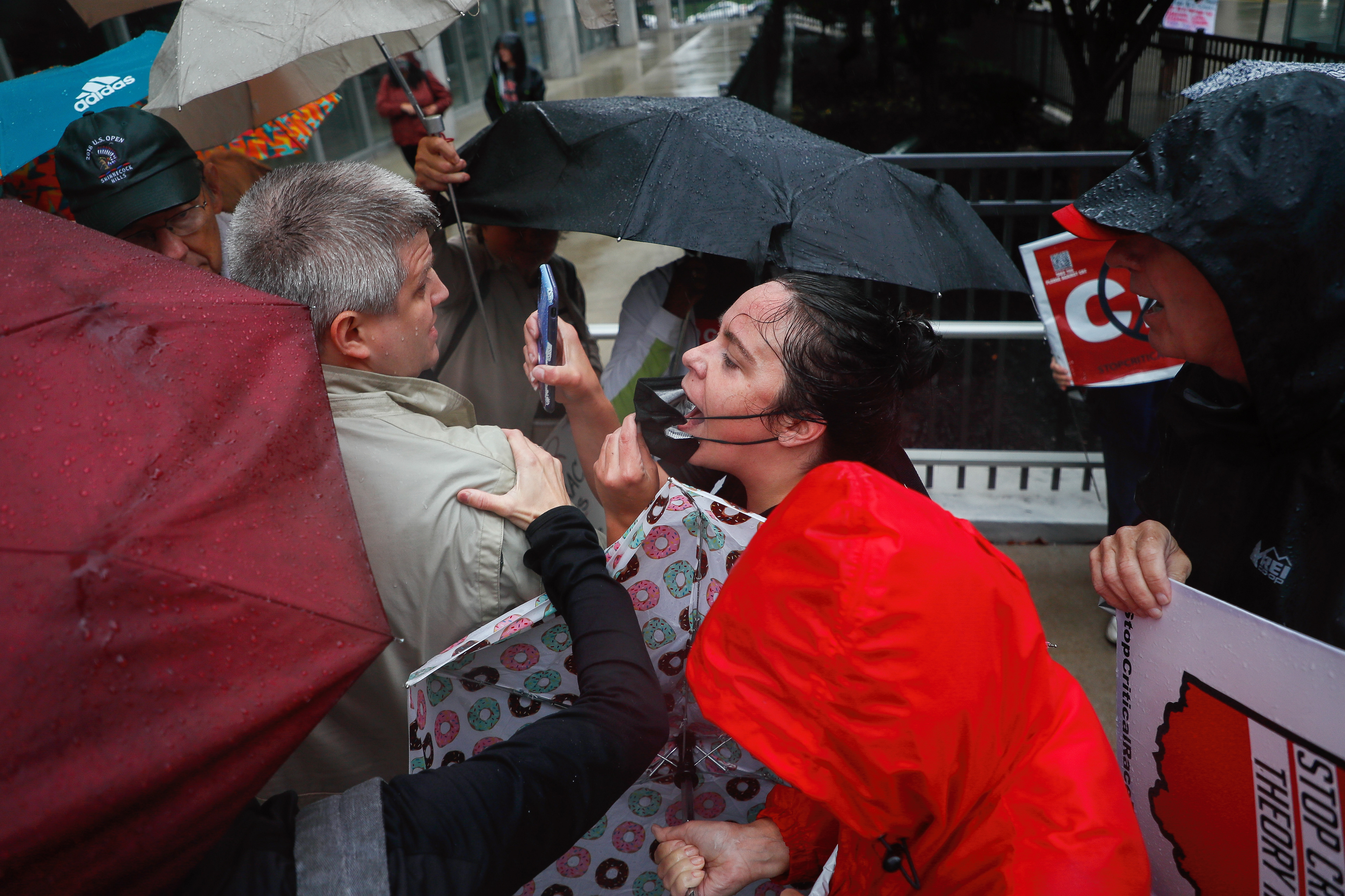 Supporters against Critical Race Theory try to block a woman, center, as she yells, "Go home, racist!" to Republican U.S. Senate candidate Josh Mandel, not pictured, as he speaks during a protest against Critical Race Theory curriculum in Ohio schools on Tuesday, Sept. 21, 2021 outside the State Board of Education in Columbus, Ohio.