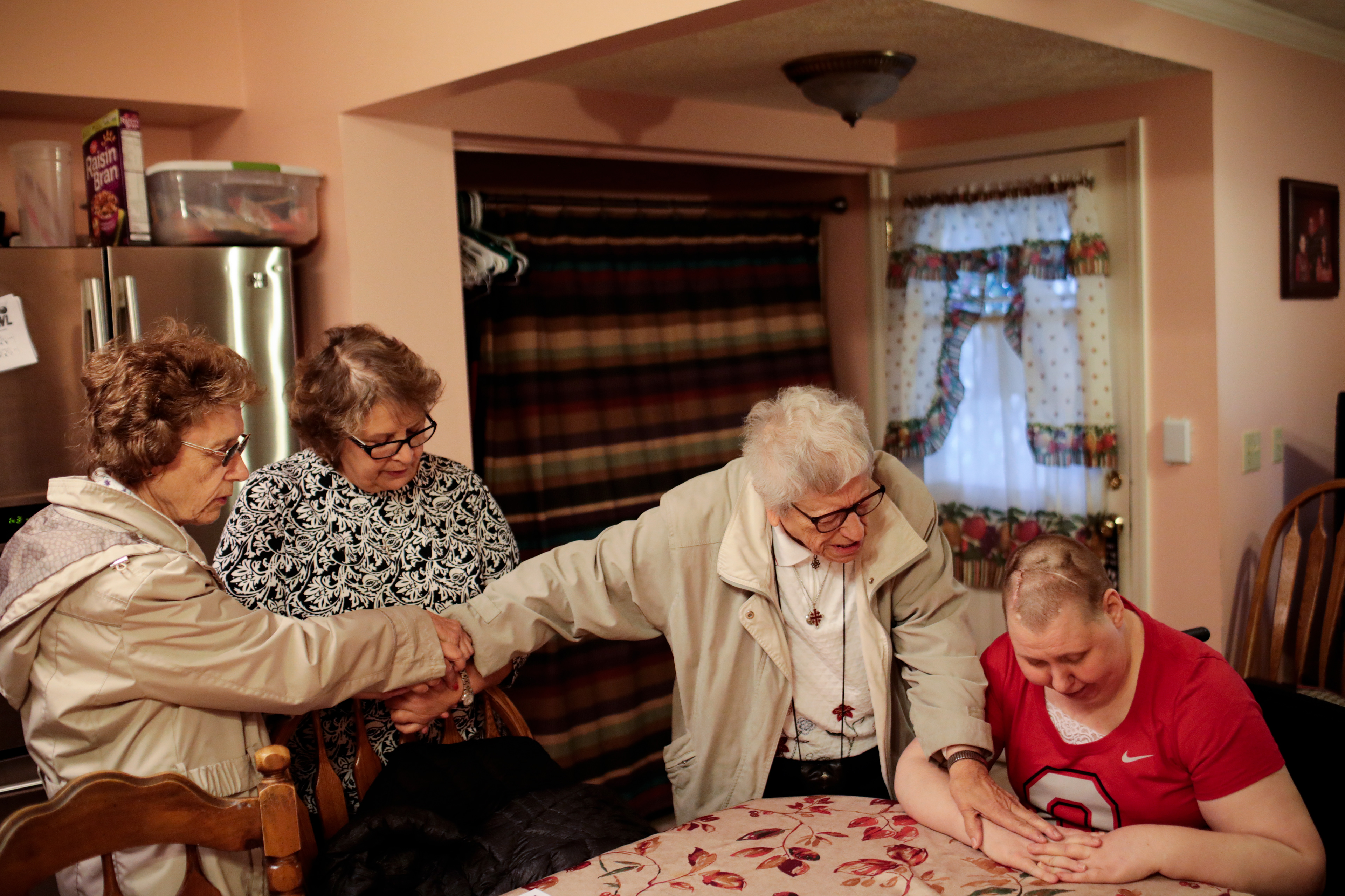 Sister Wilma Ross, center, says a prayer over Nicole Jones, right, along with St. Ladislas parishioners Carolyn Leninan, left, of Columbus, and Sandy Martin, second from left, of Canal Winchester, during a visit to Jones's home on October 29, 2018 in Columbus, Ohio. Sister Ross plans to retire at the end of the year after 54 years of service, most of which was spent serving the South Side parish.