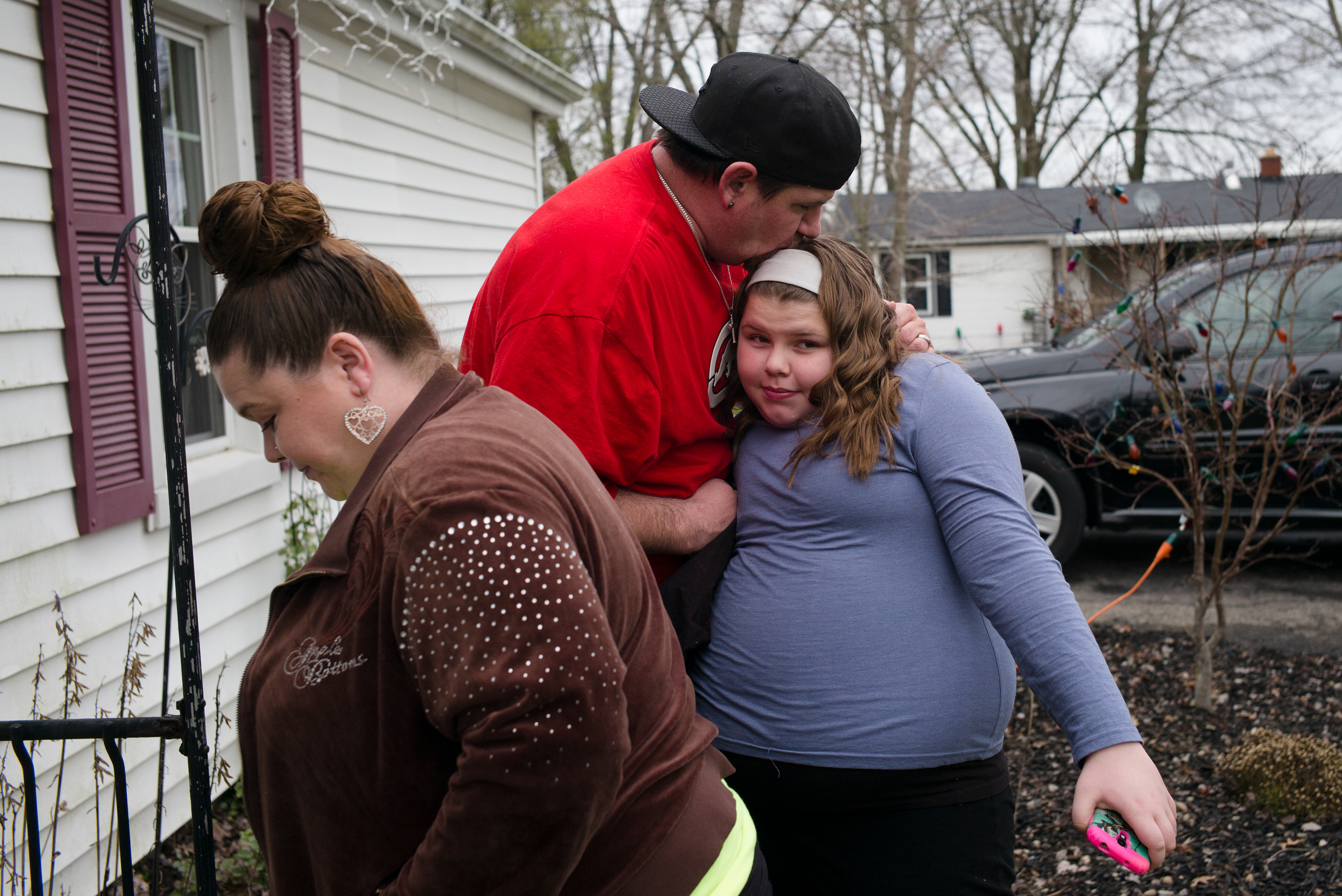 Steve Kippenberg, center, kisses his daughter, Tori, 11, right, goodbye as she leaves to spend the night with a friend on January 9, 2016 at their home in Batavia, Ohio. Steve and his wife, Fawn, left, were addicted to pills and heroin and had their four children taken away from them. Now 16 months sober, they're going through a program in a drug-treatment court, and their four kids are now back at home.