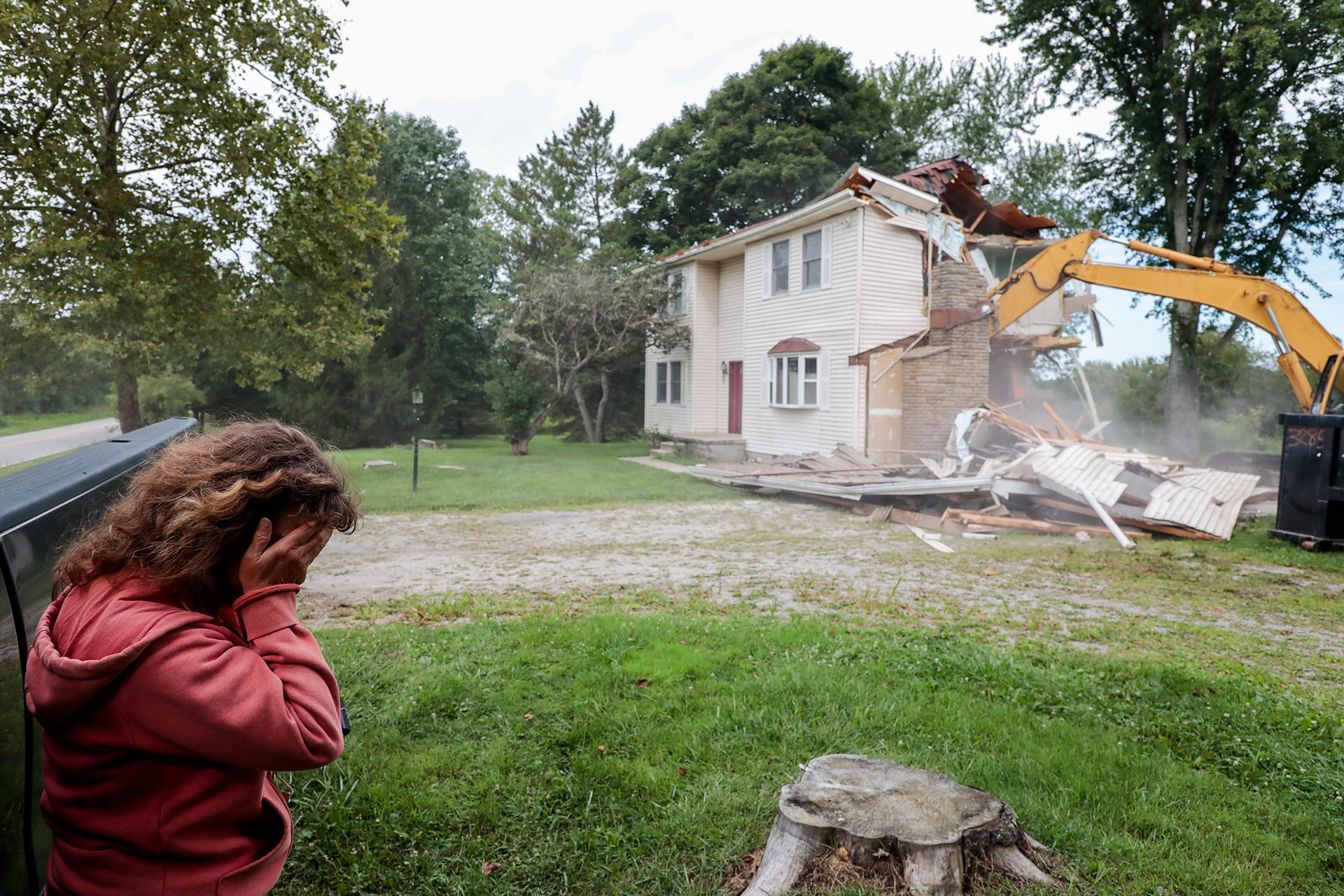 Tracy Corrigan, left, weeps as an excavator tears down her house along Morse Road on August 23, 2019 in Jersey Township, Ohio. Corrigan and her husband, Scott, bought their home in the 1980s and raised their five children there. Recently, the property was annexed into nearby New Albany from Jersey Township, and the Corrigan's sold their home to the New Albany Company to make way for development. Nearby, Facebook, Google and Amazon have all built facilites in New Albany International Business Park.