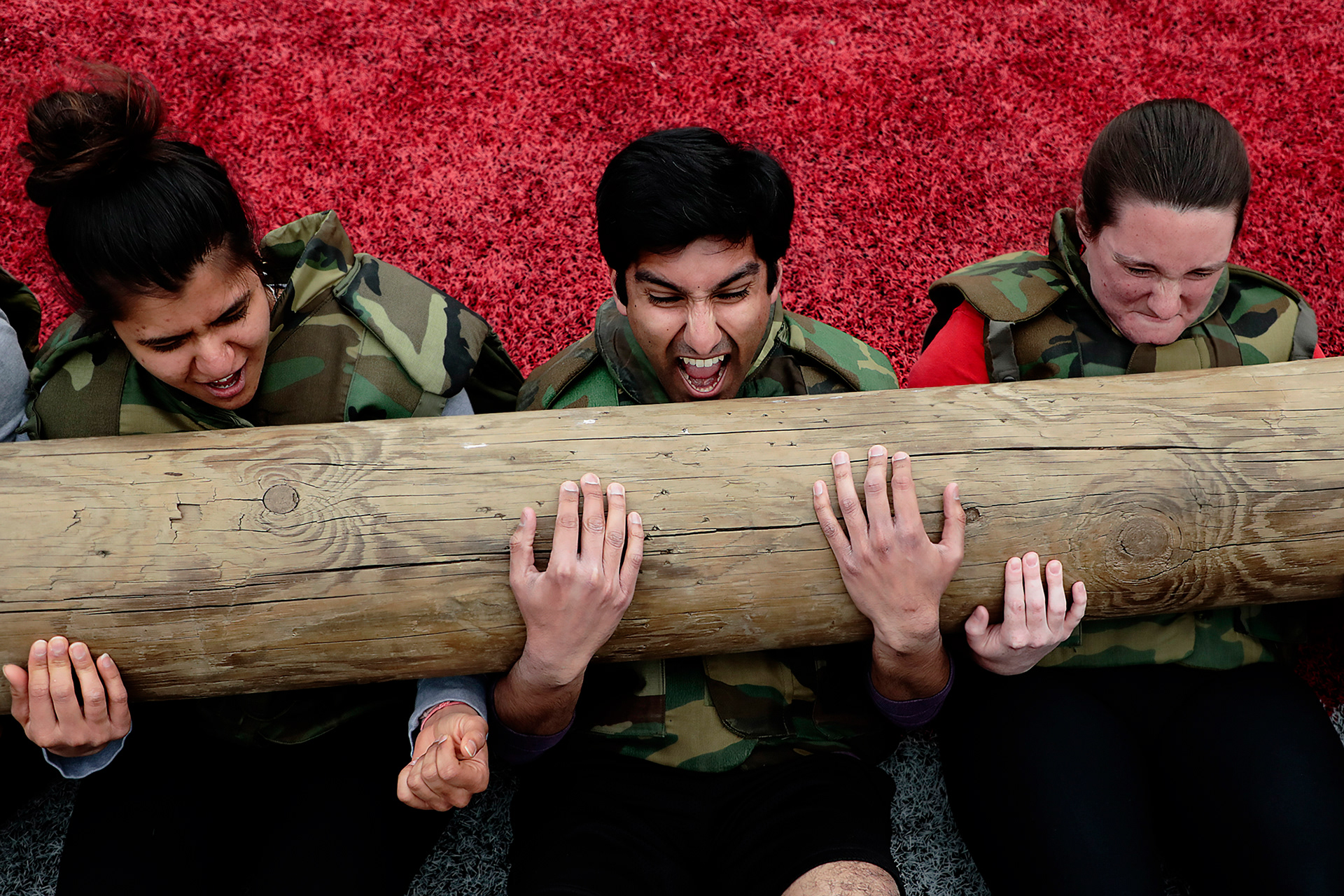 From left, Shivangi Bhardwaj, Aash Bhandari and Katie Crile perform sit-ups with a 250-pound telephone pole while wearing five-pound weight vests during the Buckeye Wellness and Ohio State University ROTC 2019 Wellness Boot Camp on April 24, 2019 at Ohio Stadium in Columbus, Ohio. The event is designed to give students the chance to see what ROTC students experience while promoting personal fitness and wellness.