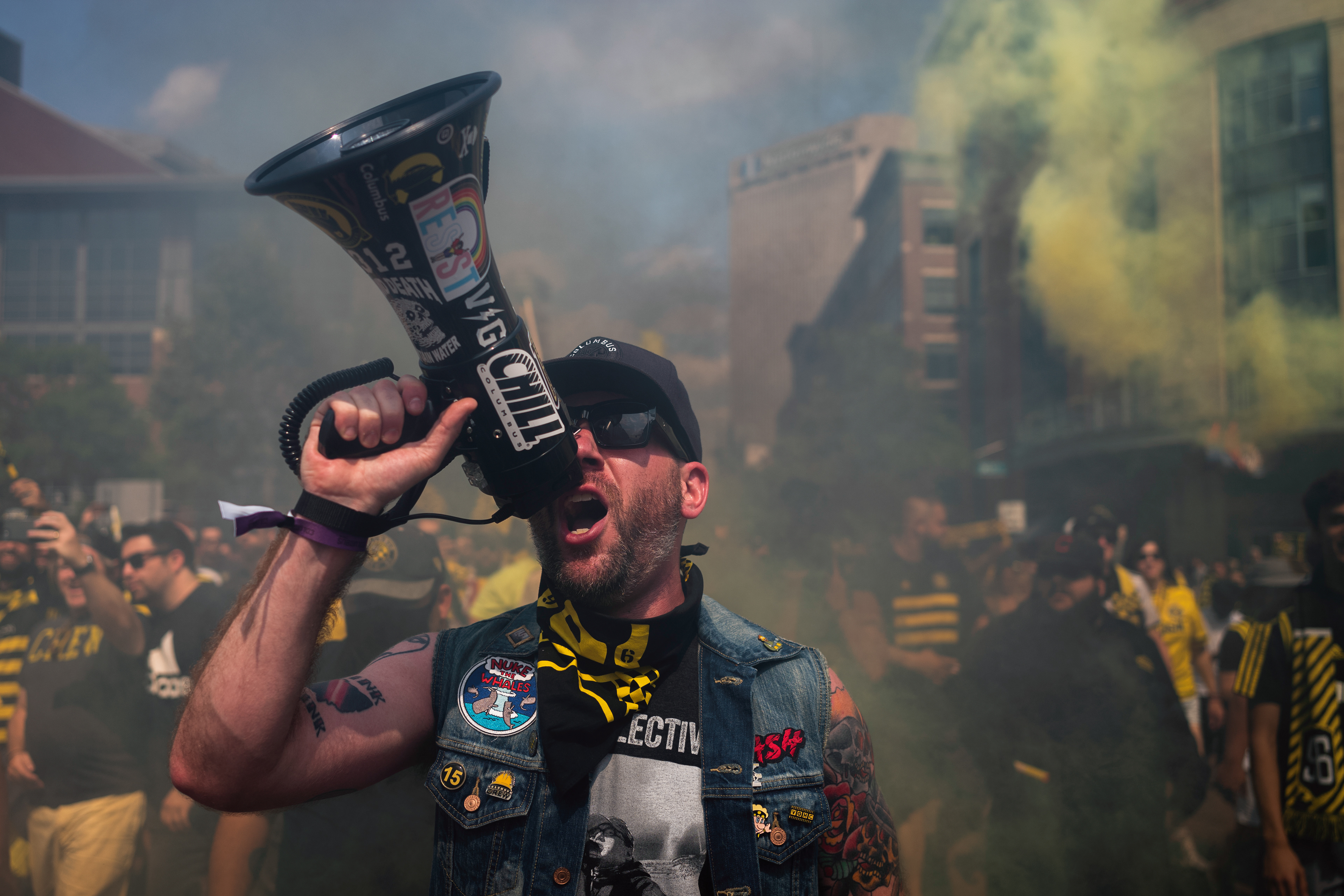 John Lavelle leads Columbus Crew fans down Nationwide Boulevard as they march to the inaugural match at Lower.com Field between the Columbus Crew and the New England Revolution on Saturday, July 3, 2021 in Columbus, Ohio.