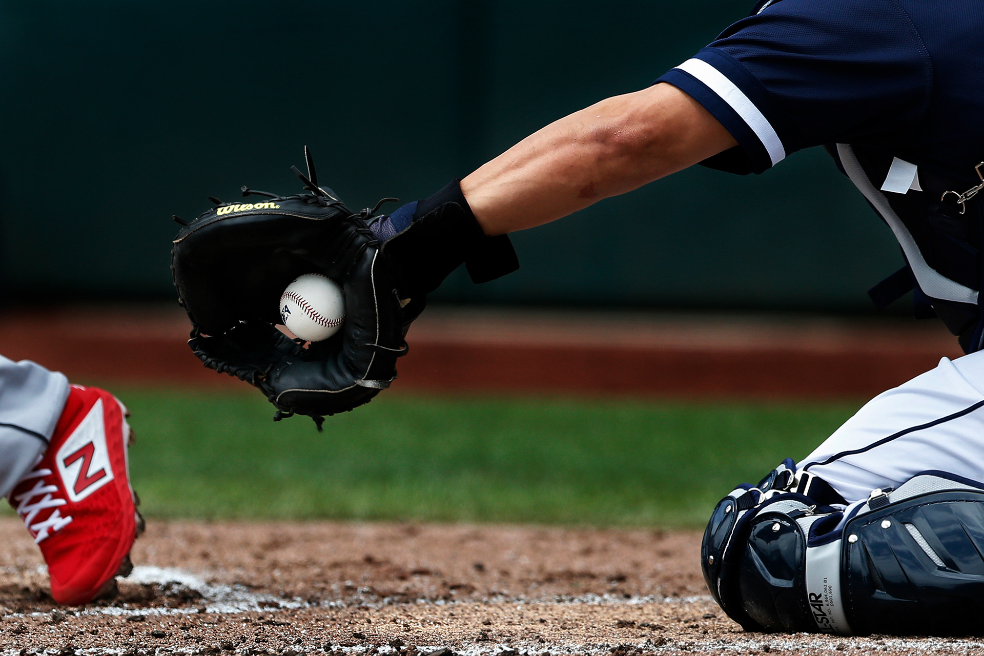 Columbus Clippers catcher Dioner Navarro (17) nabs a strike on Toledo Mud Hens shortstop Willi Castro (5) during the second inning of a International League baseball game between the Columbus Clippers and the Toledo Mud Hens on May 23, 2019 at Huntington Park in Columbus, Ohio.